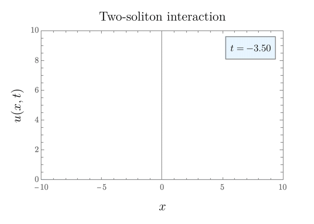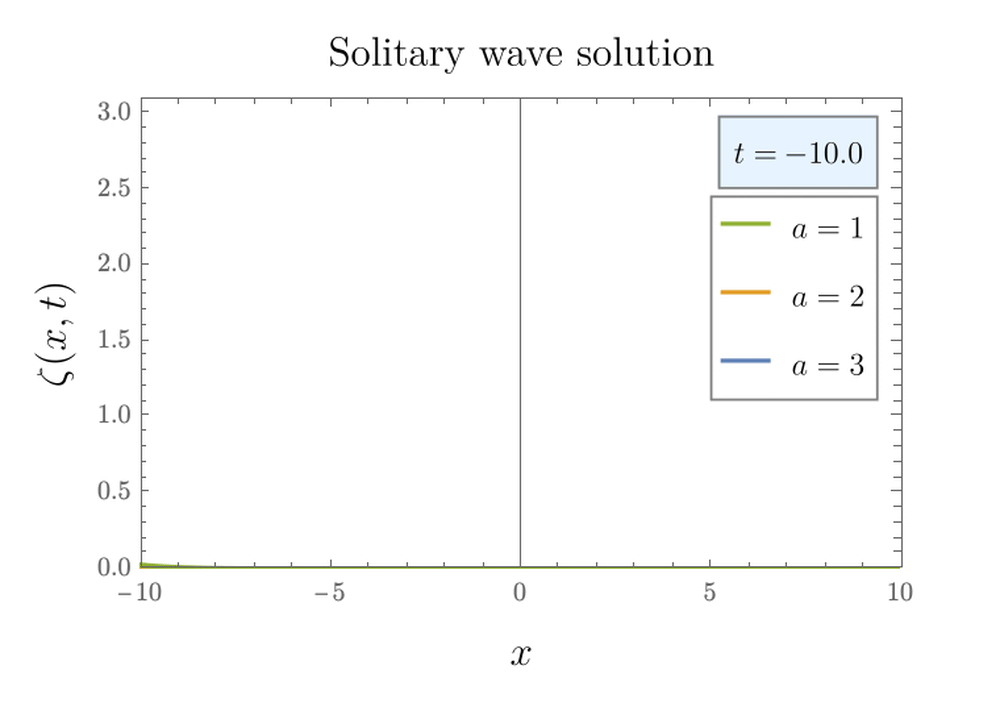 We see clearly that taller solitary waves or solitons, with greater crest amplitude \(a\), propagate faster since \(c\propto a\).