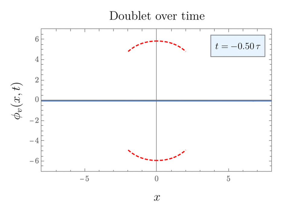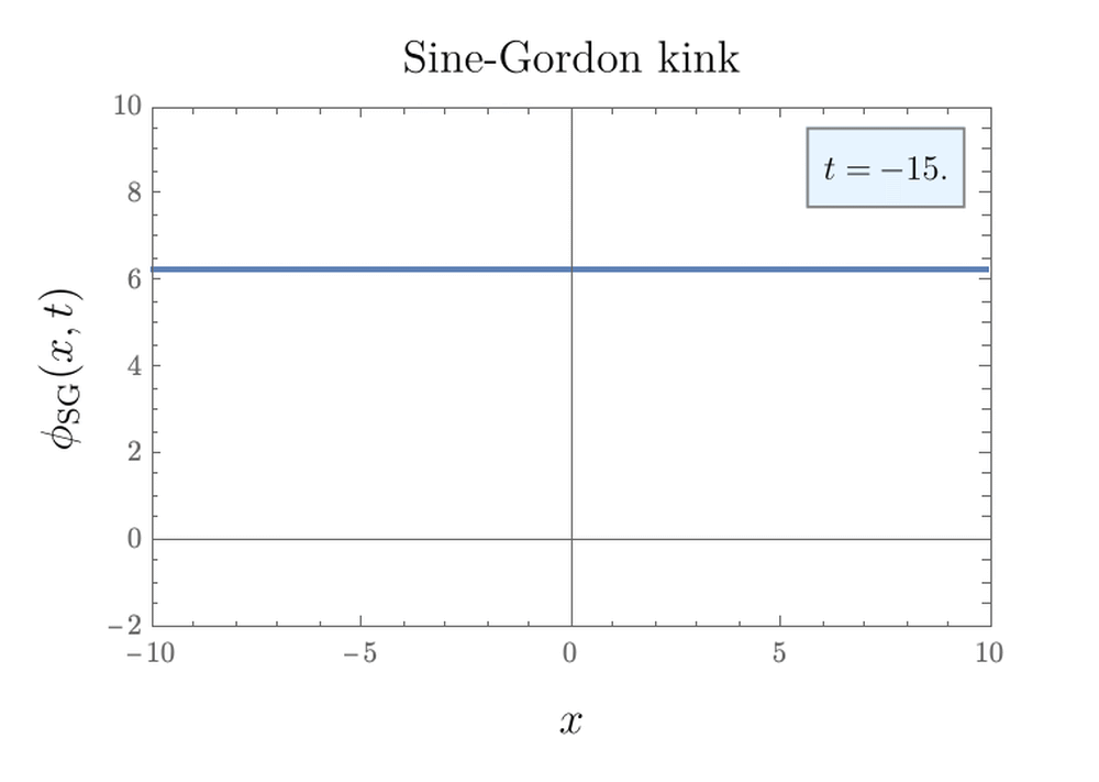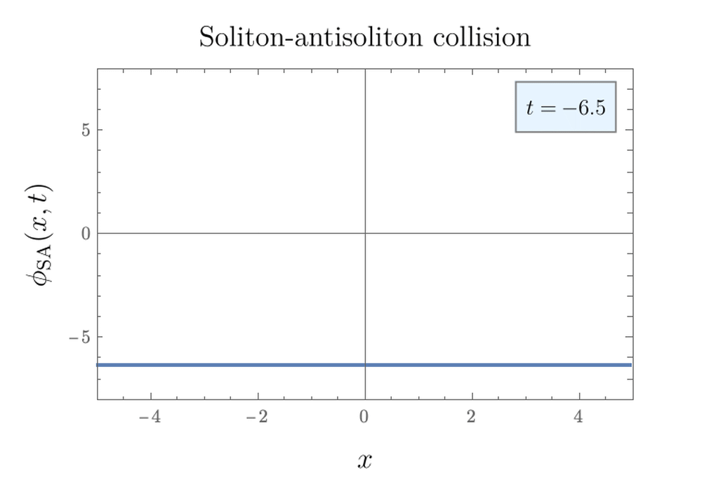 where \(\gamma=\sqrt{1-v^2}\). Since \(\phi_\text{SS}(x,t)=\phi_\text{SS}(x,-t)\), this solution corresponds to two solitons
