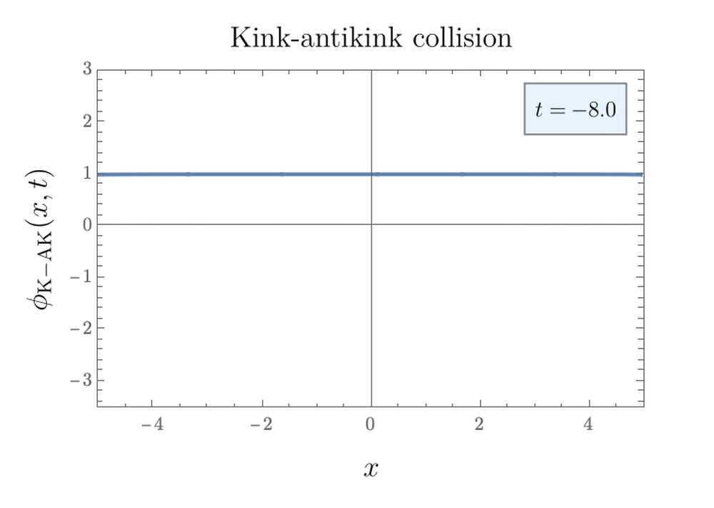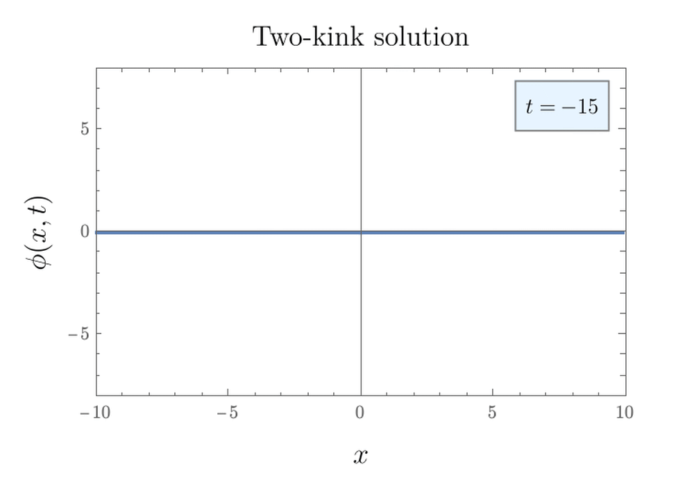 where the axis intercept \(a(t)=vt+\text{const}\) now moves in time, as animated above. One can consider kink-antikink solutions where